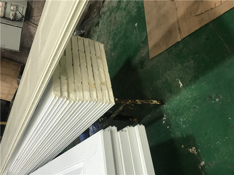③門板內(nèi)填充高密度聚氨酯發(fā)泡材料。金屬板與聚酯發(fā)泡材料結(jié)合緊密,保溫層無孔洞,形成整體,金屬板與保溫層保證10年以上不分離。門體能抗風(fēng)壓42m/秒(12級);